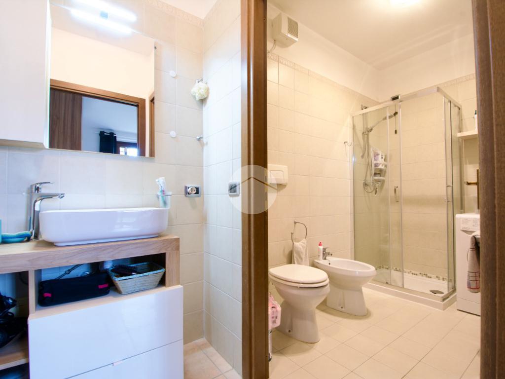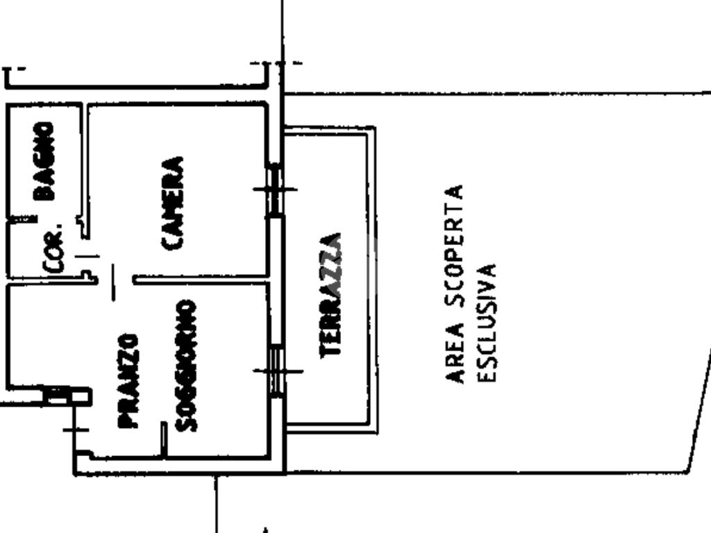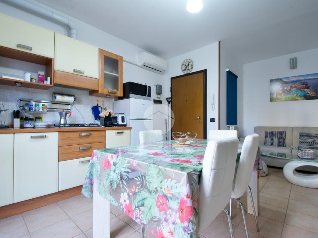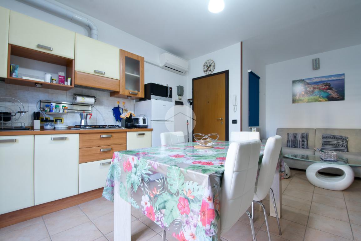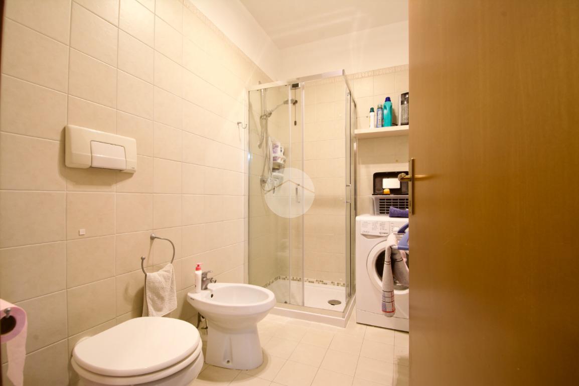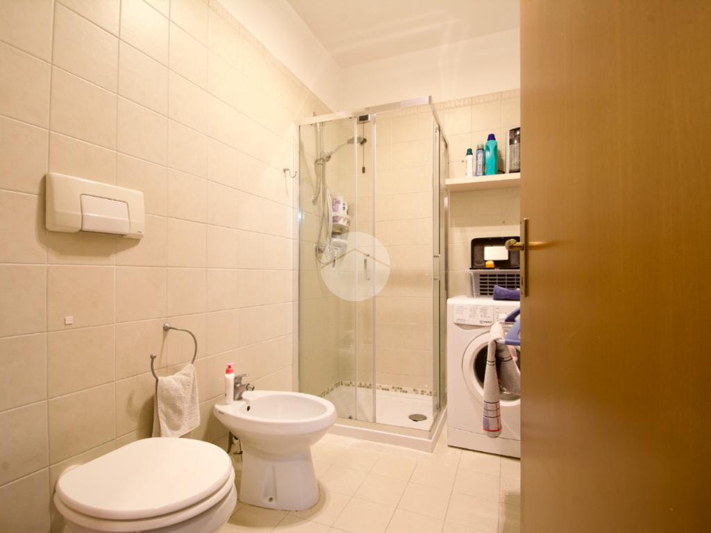 L'appartamento offre un soggiorno luminoso con angolo cottura, una camera matrimoniale e un bagno con doccia. Completano la proprietà un box auto ed una spaziosa cantina.